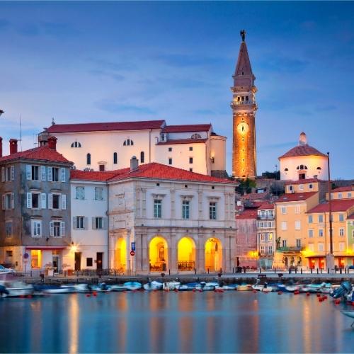 The most beautiful town on Slovenia’s coast, Piran features beautiful Venetian architecture. Explore the old town and admire the sights. One of Piran’s landmarks is the St. George’s Parish Church, located on the top of a small hill, offering stunning panoramas of the town.
