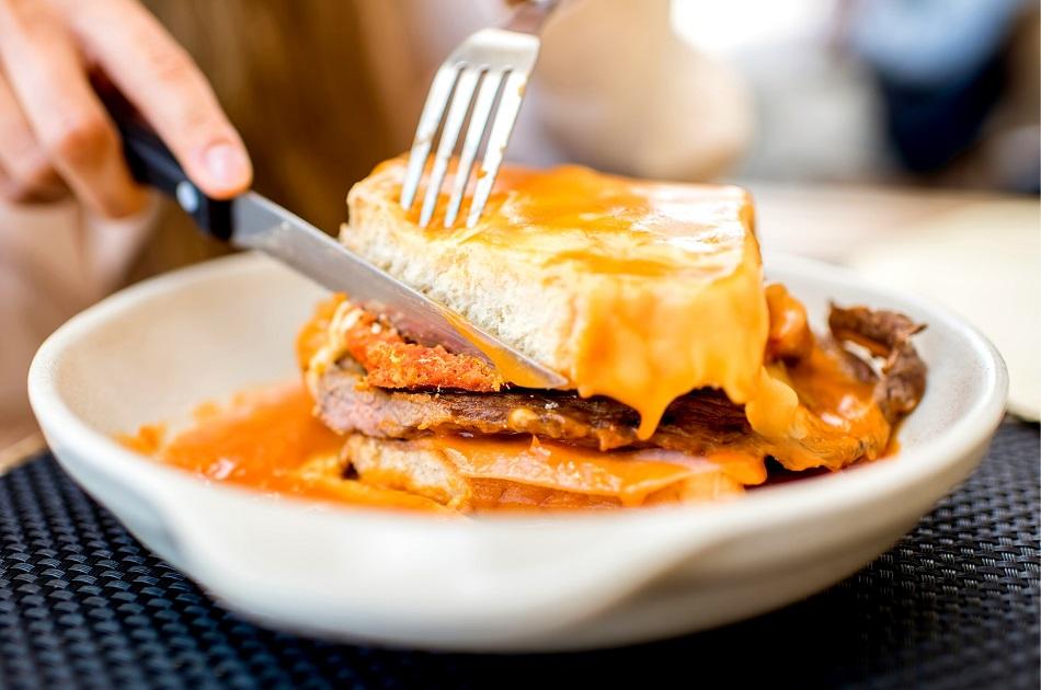 - Francesinha – A caloric bomb, specific to Porto, Francesinha is a sandwich with ham, sausage or stake meat, covered in melted cheese and drowned in tomato sauce.