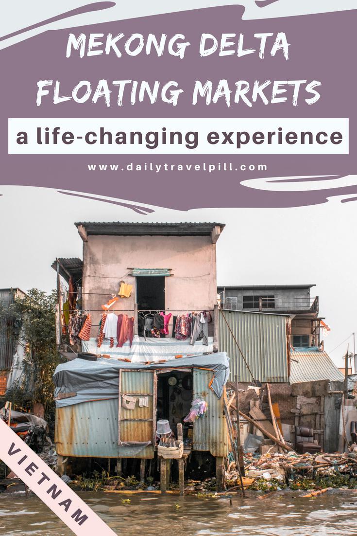 Just a few meters away from the crowded, full of tourists Mekong river floating markets there are people who live in small houses built from wood and scrap metal. These houses are built right above the river or on the edge of it.