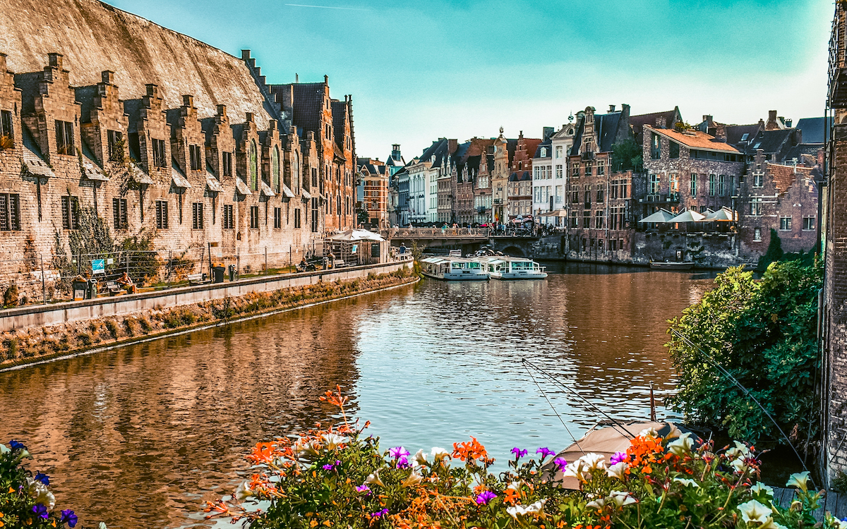 Picturesque buildings line the riverside quays while tourist boats cruise along the river with the grand Gothic St. Michael’s Church to the south and the imposing Gravensteen Castle in the distance to the north. A towering bronze sculpture of the Archangel Michael slaying the dragon is perched high on a streetlamp cramming more drama to this setting.